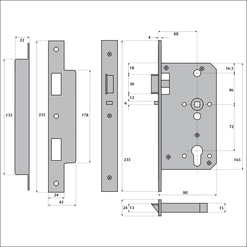 Part of our 'Euro+' range of modular sized mortice locks and latches.