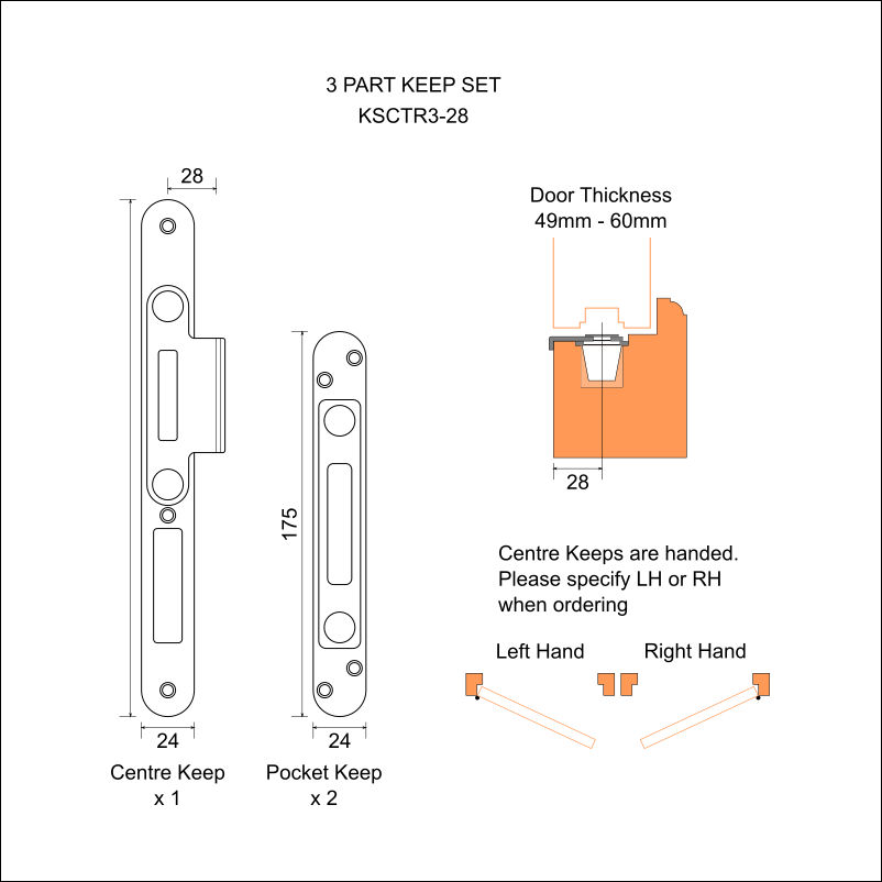 The set comprises of 1 x Centre Strike (for the main lock unit) and 2 x Pocket Keeps (for the additional top/bottom bolts).